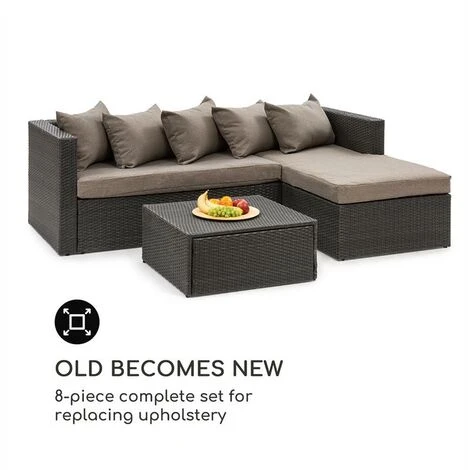 Benvenuti in estate! Con i rivestimenti Theia di Blumfeldt Theia, il vostro set lounge Theia Garden & Terraces si presenta come nuovo in un attimo. Basta rimuovere i vecchi rivestimenti dai cuscini e mettere su quelli nuovi, fatto. Le coperture in poliestere 100% sono idrorepellenti e possono essere facilmente pulite o lavate a mano. Il set è composto dagli otto rivestimenti necessari per tutti i cuscini da sedia e per schienale del Theia Lounge Set.