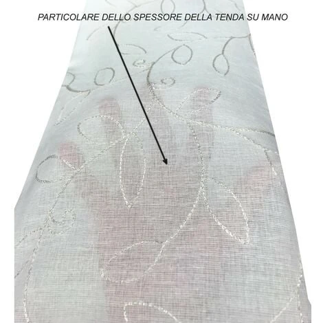 -tessuto…………………………poliestere ricamato -composizione tessuto…………….100% poliestere -funzione tessuto………………….semitrasparente -finitura superiore………………………………..tunnel -finitura inferiore……………………………………orlo -colore……………………………………………bianco -larghezza…………………………………………..cm. 60 -altezza…………………………cm.150 oppure cm.240 -confezione…………………………………………..2 teli