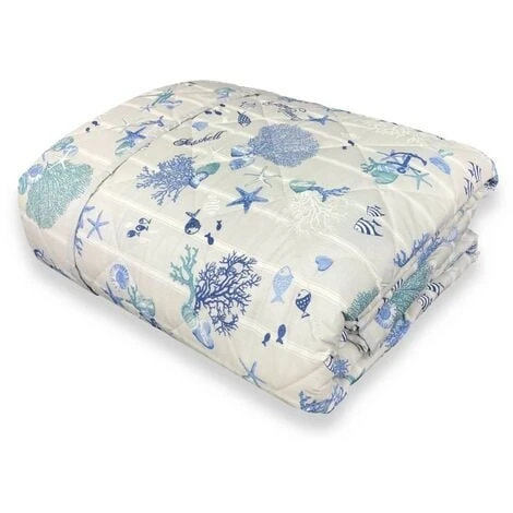 Copriletto trapuntato di qualità, modello ‘mare blu‘ con coralli e soggetti marini che ispirano questa nuova fantasia.