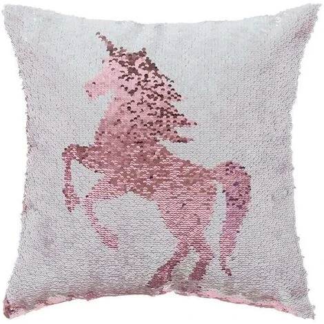 Realizzato interamente in morbido tessuto 100% Poliestere in colore rosa, ricoperto di paillettes in colore bianco e rosa con stampa unicorno, dimensioni 40x40cm.