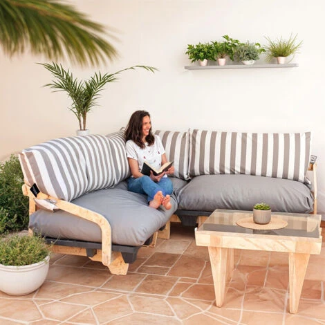 I cuscini per pallet Happers realizzati con tessuto Toldotex sono la scelta più resistente per i divani pallet. La nuova gamma di colori, disponibili in design lisci o a righe di 5 cm, dona un aspetto mediterraneo che permette di abbinarlo facilmente ai tuoi spazi esterni come la terrazza, l’area relax, il giardino o la piscina. Molti dei nostri clienti li utilizzano anche in interni.