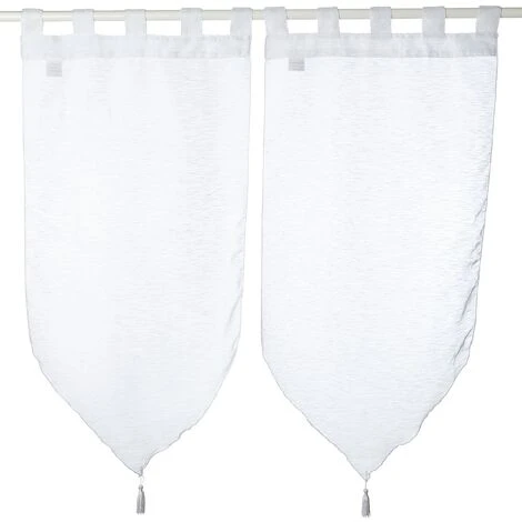 Coppia di tende in voile di poliestere, con nappa, color bianco.