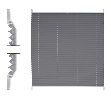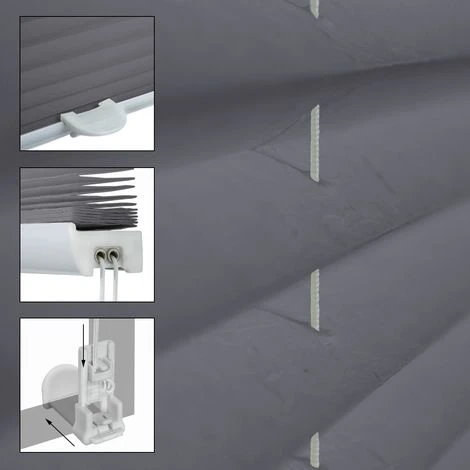 L’installazione viene eseguita mediante staffe di serraggio sul telaio della finestra. Guida superiore e inferiore regolabili all’infinito. Adatto per finestre a rotazione verticale / inclinazione – non adatto per finestre da tetto. Per il posizionamento ottimale delle pieghe, si prega di scegliere la misura in modo che la larghezza pieghettata nella larghezza a destra e sinistra si estenda per ca. da 1 a 1,5 cm oltre la finestra.