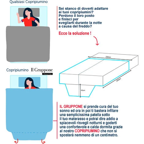 Praticità: Studiato per una praticità e una velocità di vestizione non comune con la speciale banda patella di tessuto da infilare sotto al materasso cosi che resti fisso e stabile per tutta la notte, i pratici tagli consentono l’inserimento del piumino e dei guanciali in pochi secondi