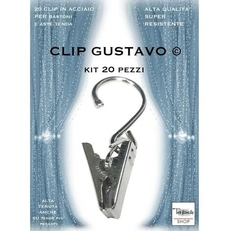 CLIP GUSTAVO © in acciaio inossidabile, molto robuste e resistenti sono l’ideale per sorreggere qualsiasi tipo di tenda, ideale su tutti i cavi in acciaio oppure sui bastoni con anelli. Sono dotati di ganci ad ‘ ESSE ‘ e sono quindi adattabili a tutti i tipi di bastone sia con anelli e ai cavi di acciaio.